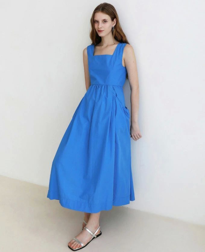 Featuring a flattering square neckline, wide shoulder straps, and practical side pockets, this airy midi silhouette is your go-to piece for warm days — whether you're in the city or on vacation.