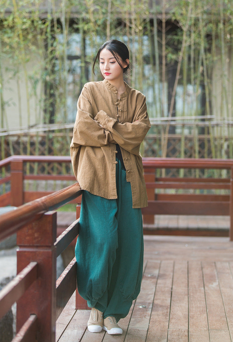- Details: Button closures made from linen, nature-inspired design