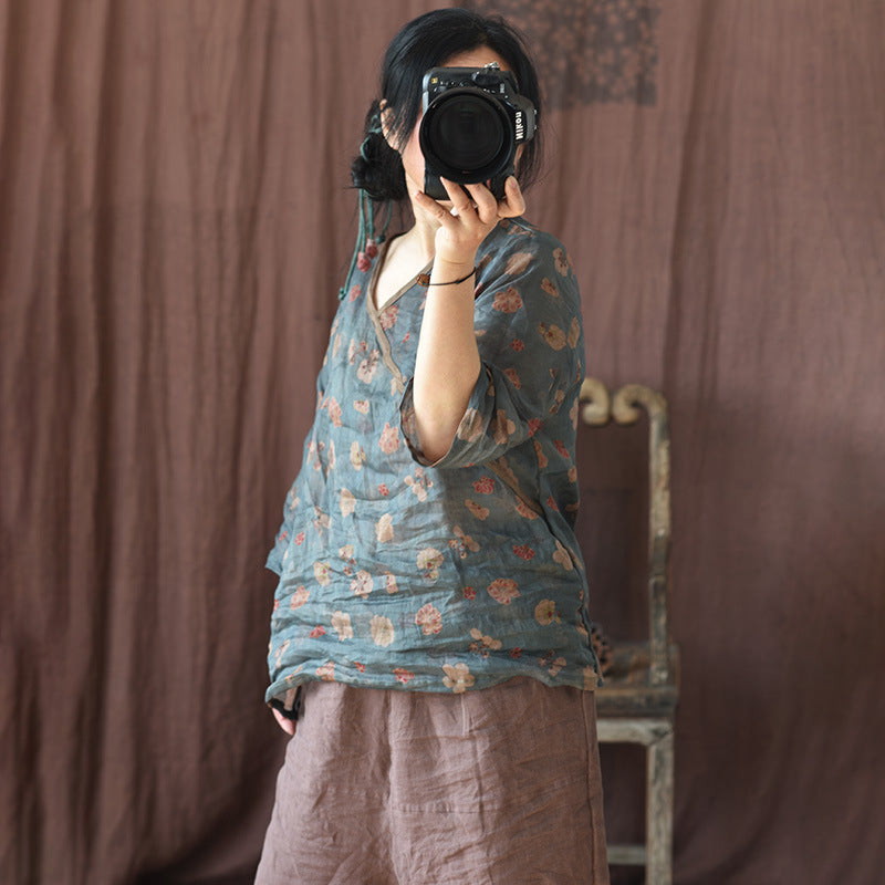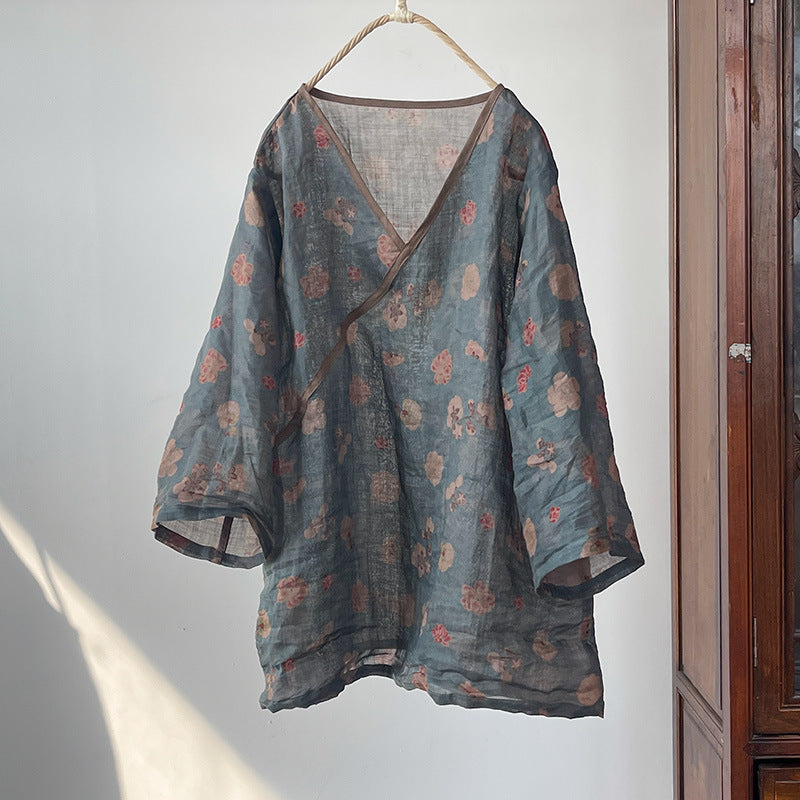 Description: Crafted from natural rami fabric, this Vintage Floral Wrap Blouse offers an elegant style with its wrap front design. Thanks to its sun-protective qualities, it can be comfortably worn outdoors. Its lightweight and breathable structure makes it a perfect option for those seeking comfort and style. Ideal for the spring and summer months, this blouse combines the soft tones of nature with a modern touch to create a vintage aesthetic.