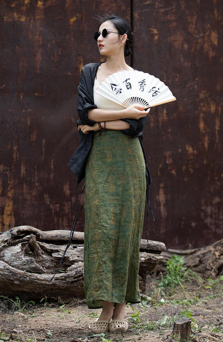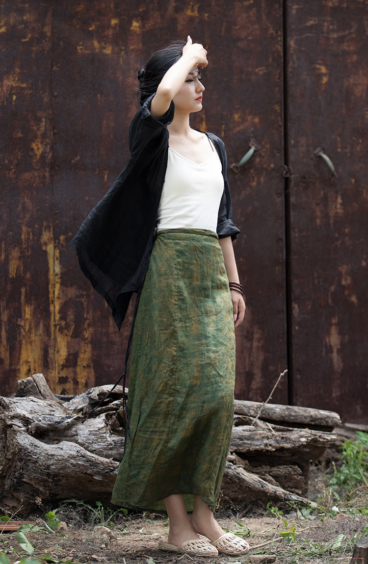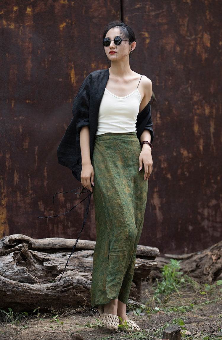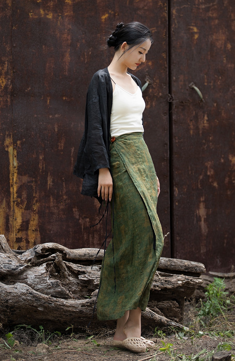 Crafted from a natural cotton-linen blend, the Vintage Wrap Linen Skirt combines elegance with comfort. Featuring a beautiful green print, this midi-length skirt embraces a vintage aesthetic. Its wrap-around design with button closure ensures a perfect fit while adding a timeless charm. Ideal for those who appreciate effortless style and natural fabrics!