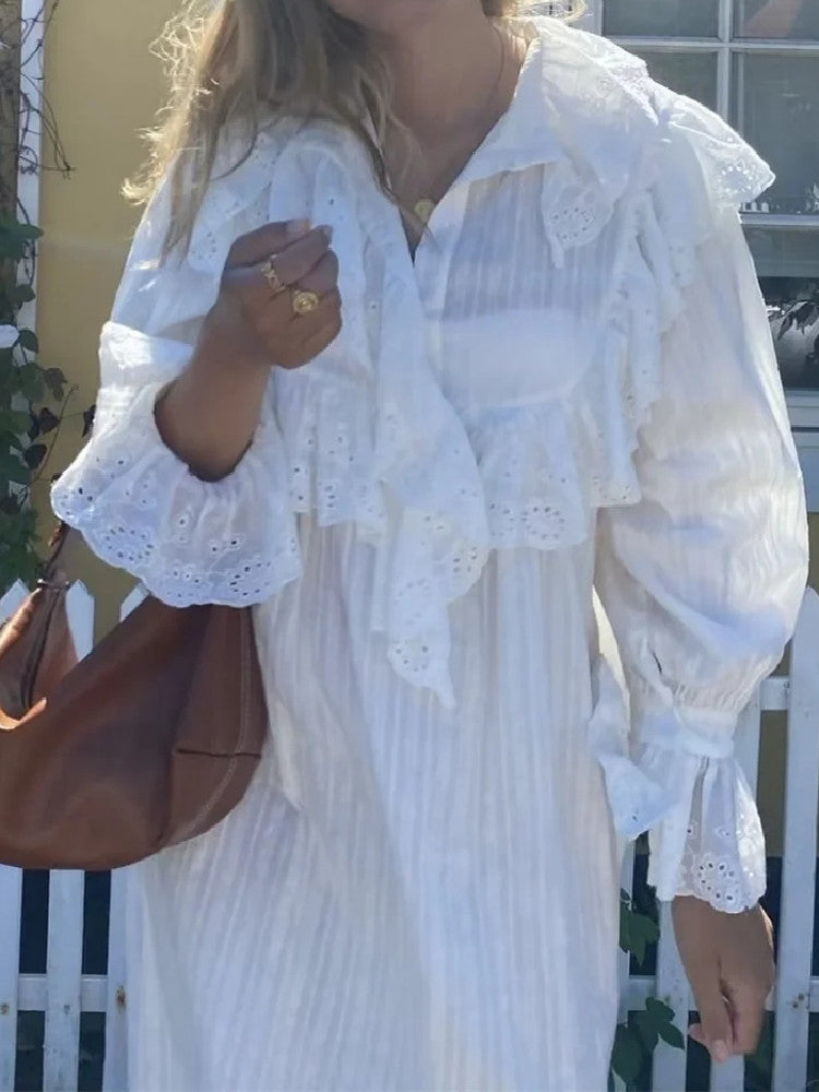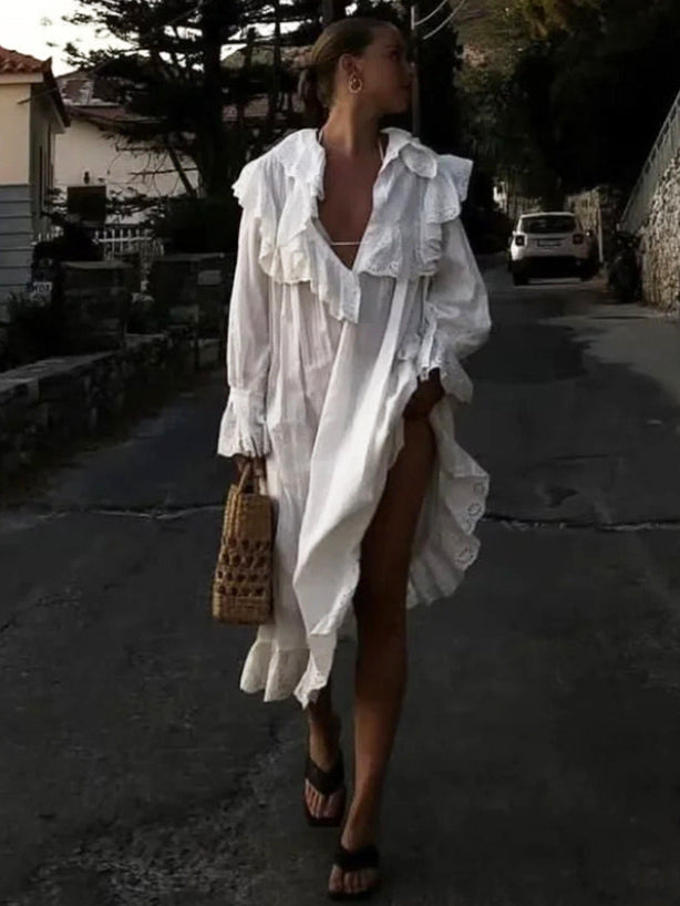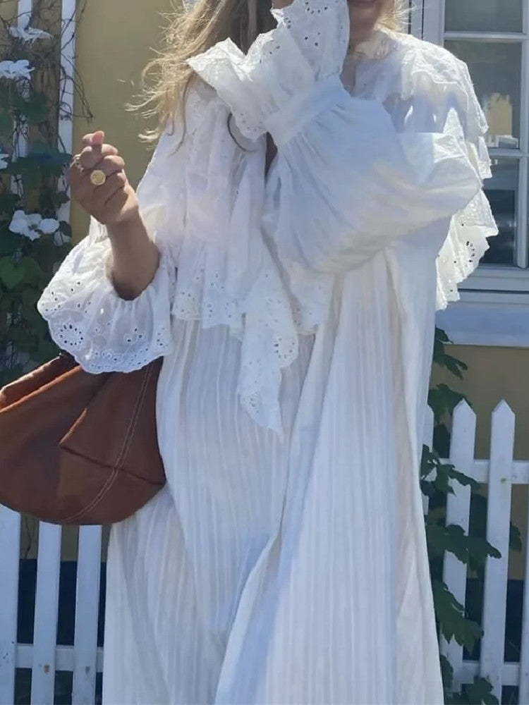 Donde la elegancia natural se fusiona con el encanto bohemio, el vestido BohoLace está confeccionado con 95 % de algodón para ofrecer comodidad y transpirabilidad durante todo el día. Con delicados detalles de encaje en las mangas largas y un elegante bajo con volantes, este vestido midi blanco captura la esencia de la feminidad natural. Ya sea que estés paseando por calles soleadas o disfrutando de una escapada fresca, su suave caída y su estilo vintage lo convierten en tu compañero perfecto para el verano.