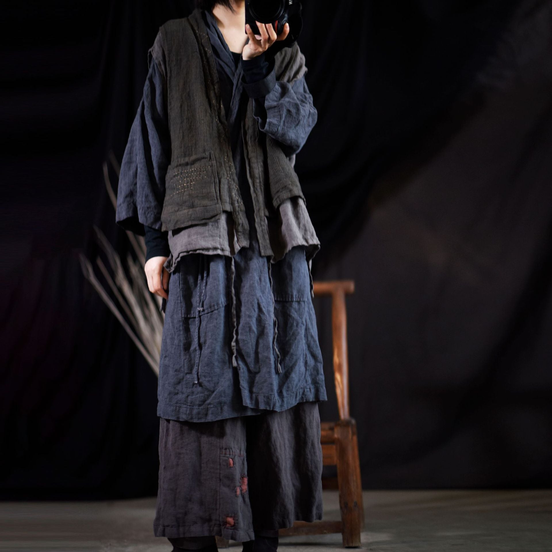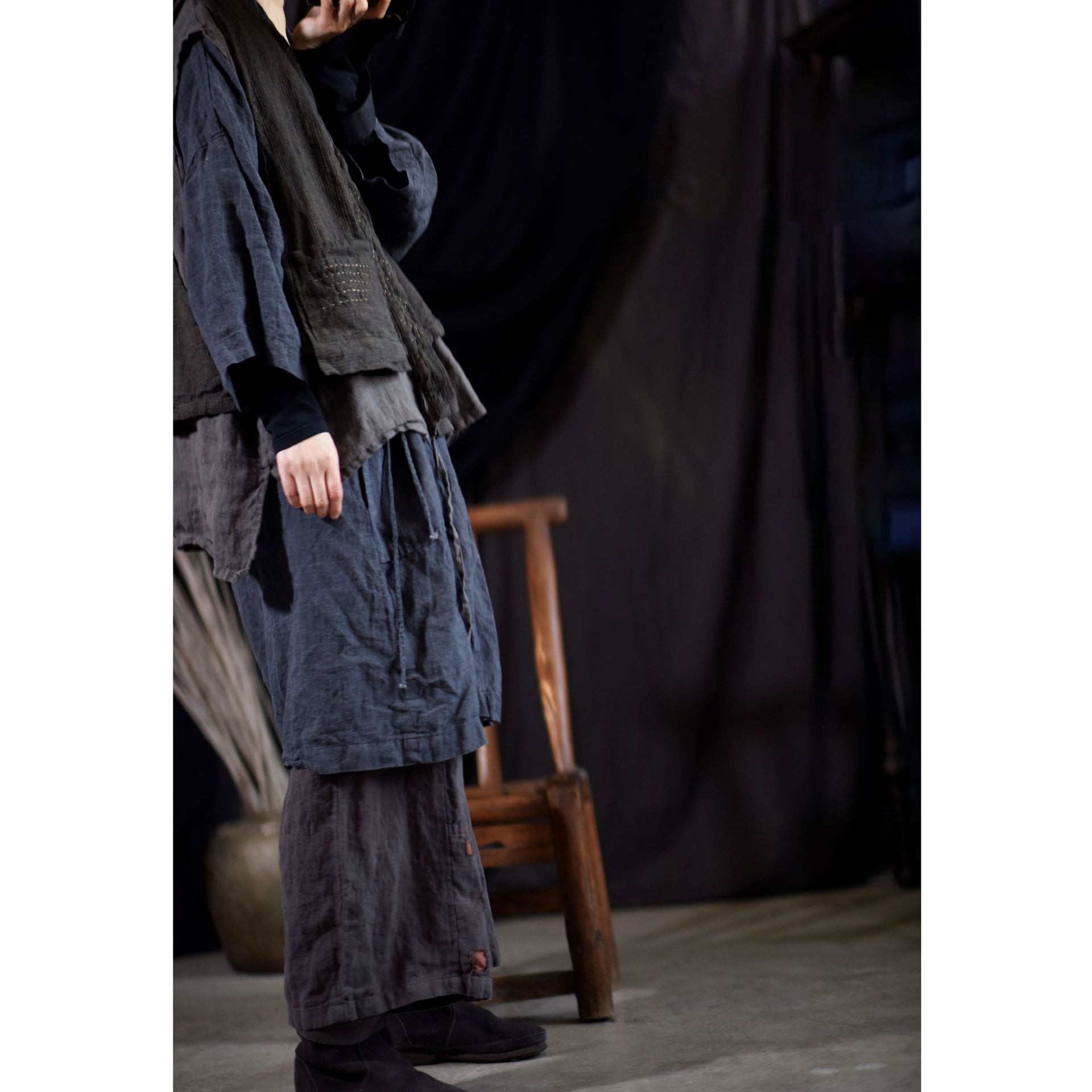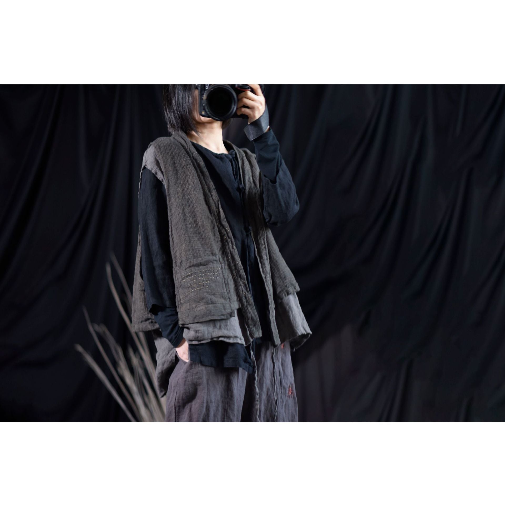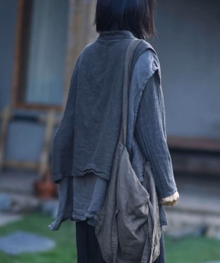 Este chaleco de inspiración vintage está confeccionado en una mezcla de algodón y lino con un diseño de doble capa. Los prácticos detalles de los bolsillos le añaden encanto, convirtiéndolo en una prenda elegante y versátil para combinar con otras prendas.
