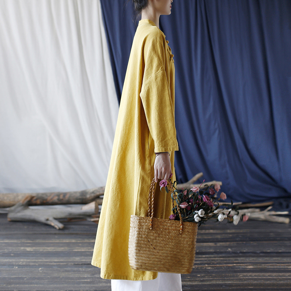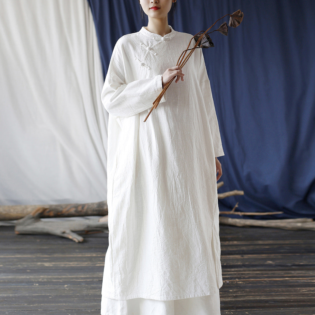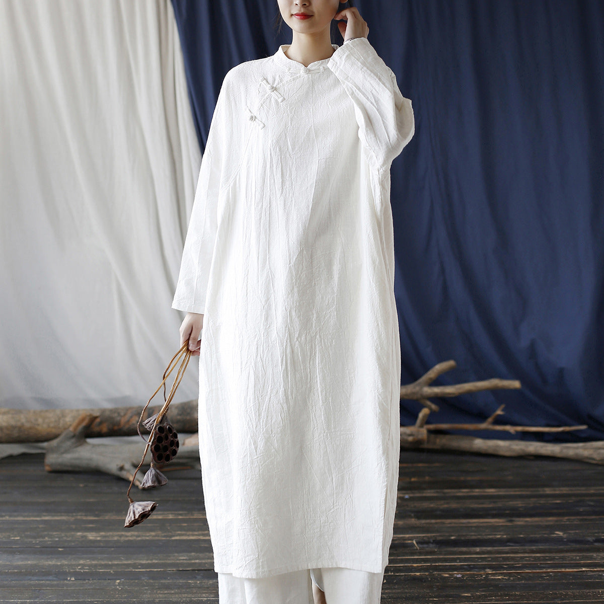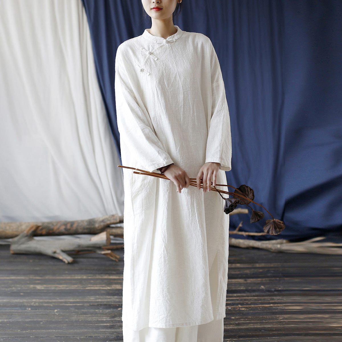 Una prenda versátil que puede usarse como túnica o vestido, confeccionada con 95 % de lino rami. Este diseño oversize de manga larga presenta aberturas laterales y botones frontales del mismo tejido, lo que le da un aspecto sofisticado y relajado.