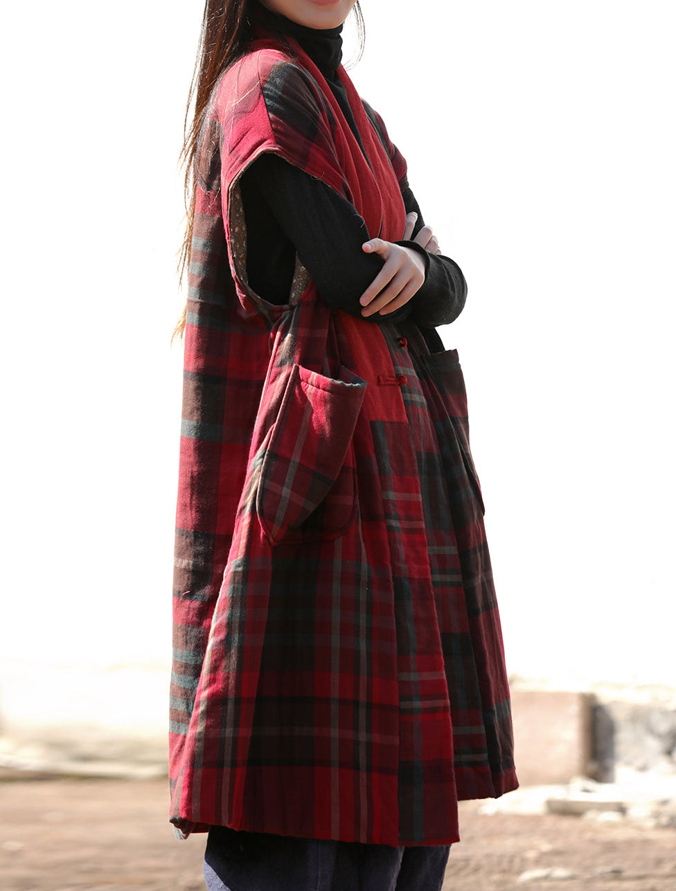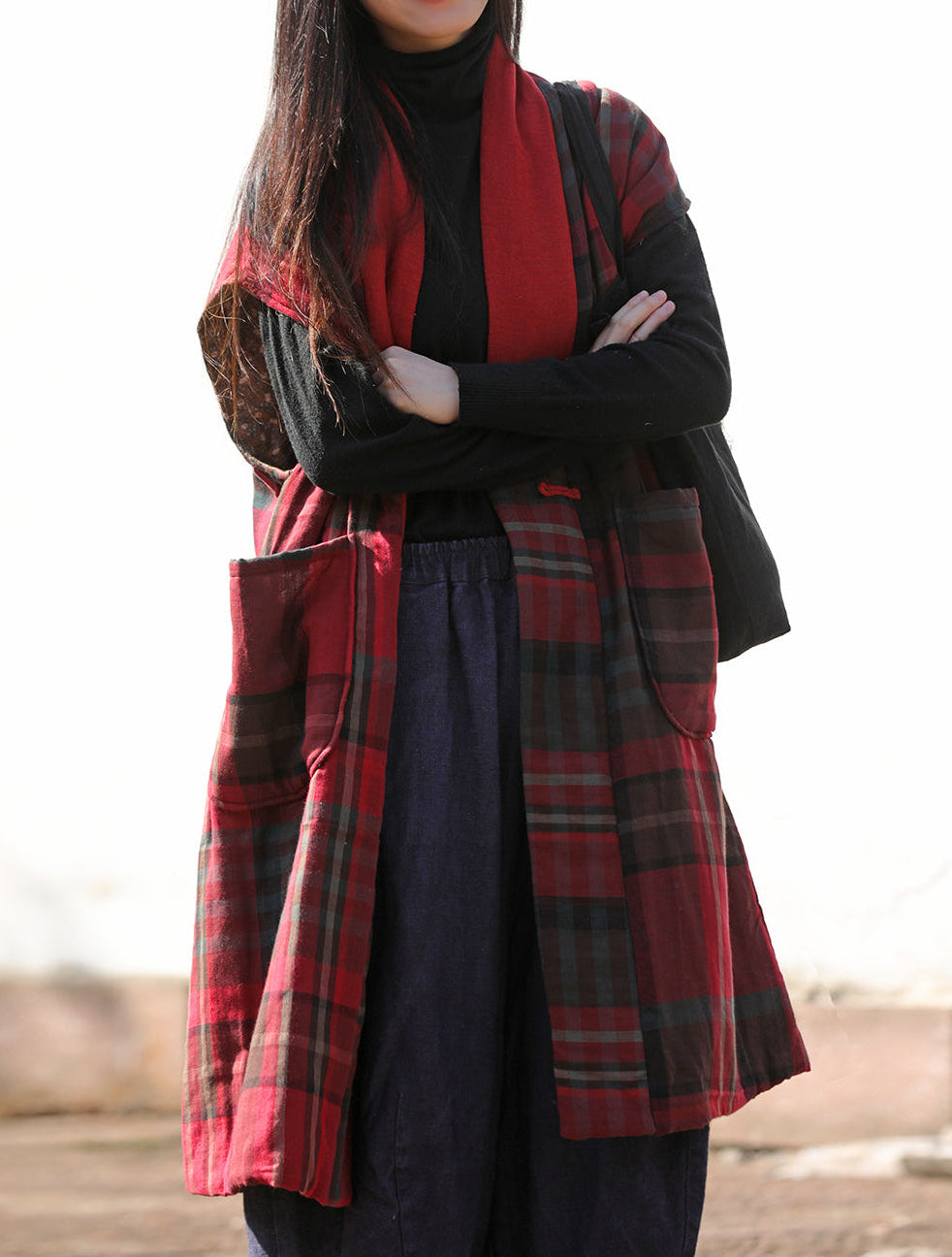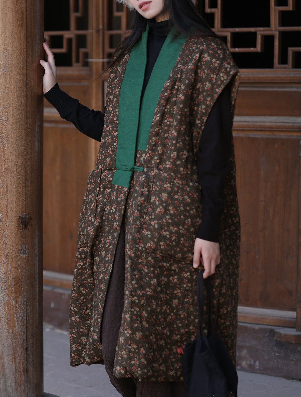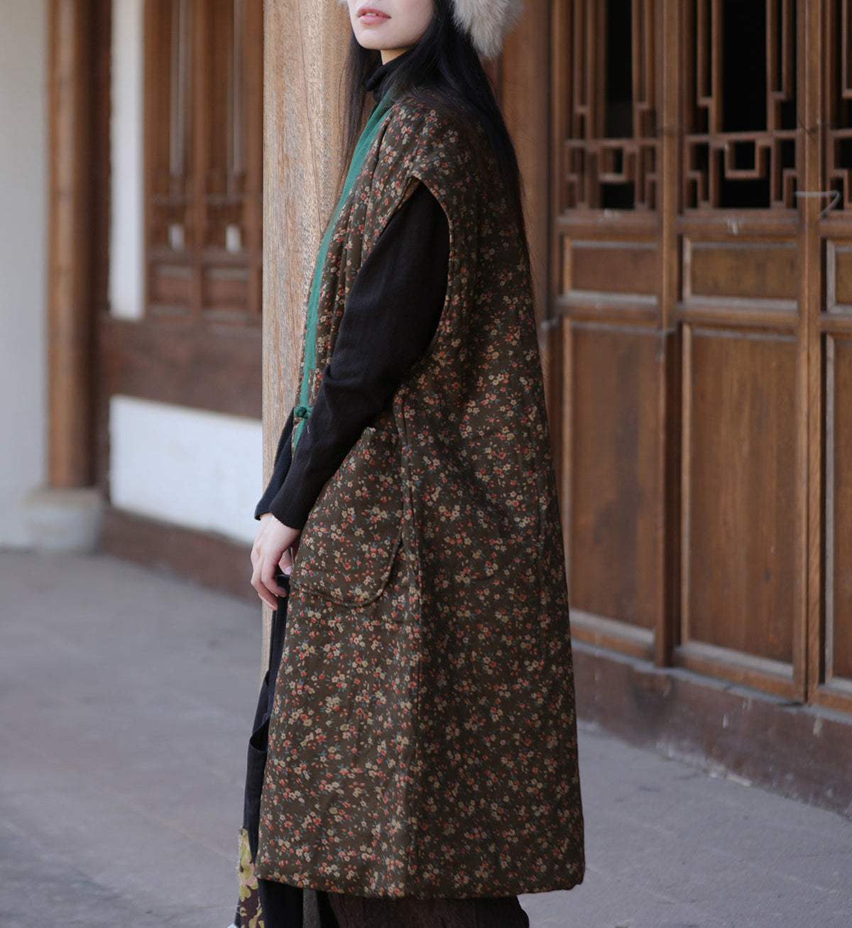 Featuring exquisite carved buttons that symbolize traditional artistry, this sleeveless padded vest bridges the past and present with elegance. The ethnic-style prints reflect cultural heritage and add character to everyday outfits. Its loose-fitting silhouette makes it versatile perfect to wear on its own or layered over knitwear, dresses, or long-sleeve tops.
