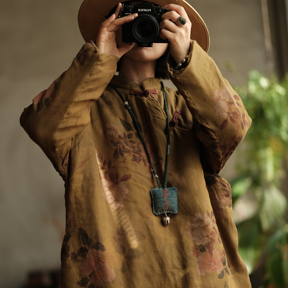 Confeccionado en 100 % algodón puro, el vestido túnica Vintage Bloom con detalle de botones combina una elegancia atemporal con una funcionalidad versátil. Con delicados estampados florales y botones forrados en tela en los laterales y la parte delantera, esta prenda irradia una encantadora estética vintage. Su diseño de doble capa con suave relleno de algodón garantiza comodidad y calidez, lo que lo hace perfecto para los días más fríos.