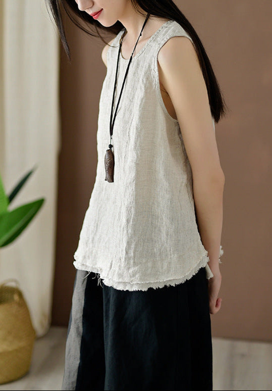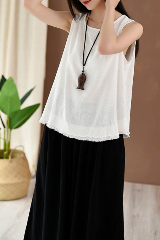 Descripción: La blusa de lino sin mangas Vintage Breeze ofrece un look limpio y desenfadado gracias a su tejido transpirable y ligeramente elástico, y a su elegante escote redondo de inspiración vintage. Su corte estándar relajado proporciona comodidad durante todo el día y favorece a distintas siluetas.