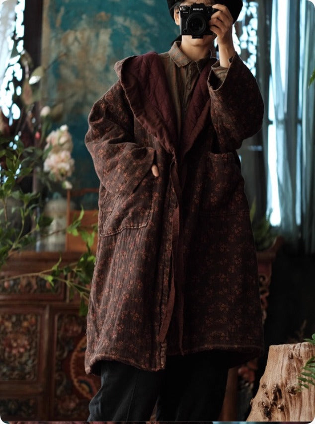 Designed with an oversized silhouette, a cozy hood, and tie-front closure, it brings both comfort and sophistication to your fall and winter wardrobe. The floral-inspired vintage pattern adds a touch of artistry, making each piece unique. Functional large front pockets make it both practical and effortlessly chic — perfect for layering over your favorite outfits.